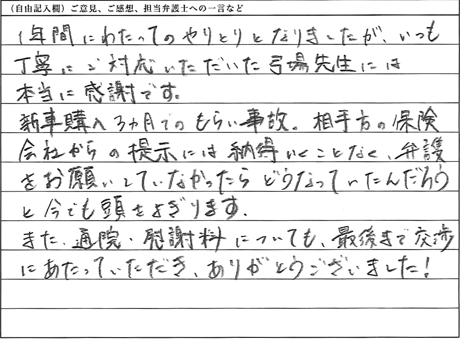 1年間にわたってのやりとりとなりましたが、いつも丁寧にご対応いただいた弓場先生には本当に感謝です。新車購入3ヵ月でのもらい事故。相手方の保険会社からの提示には納得いくことなく、弁護をお願いしていなかったらどうなっていたんだろうと今でも頭をよぎります。また、通院・慰謝料についても、最後まで交渉にあたっていただきありがとうございました!