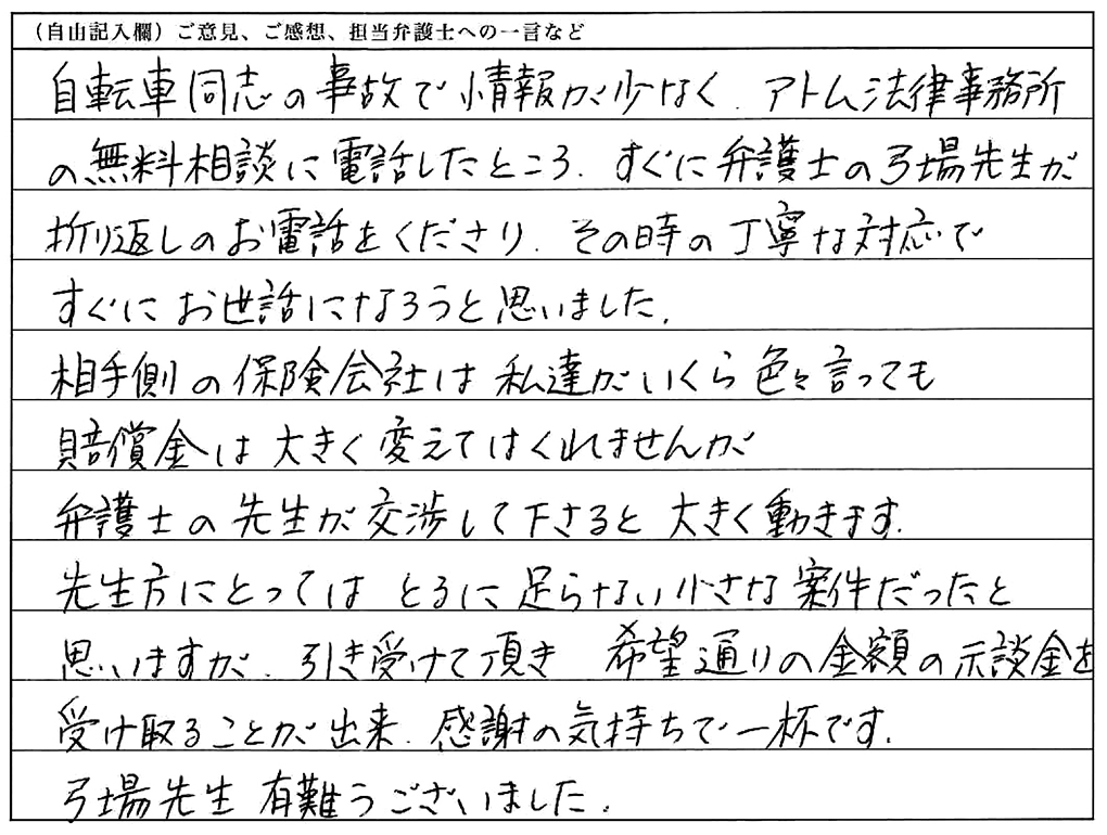 自転車同士の事故で情報が少なく、アトム法律事務所の無料相談に電話したところ、すぐに弁護士の弓場先生が折り返しのお電話をくださり、その時の丁寧な対応ですぐにお世話になろうと思いました。相手側の保険会社は、私達がいくら色々言っても賠償金は大きく変えてはくれませんが、弁護士の先生が交渉して下さると、大きく動きます。先生方にとってはとるに足らない小さな案件だったと思いますが、引き受けて頂き希望通りの金額の示談金を受け取ることが出来、感謝の気持ちで一杯です。弓場先生、有難うございました。