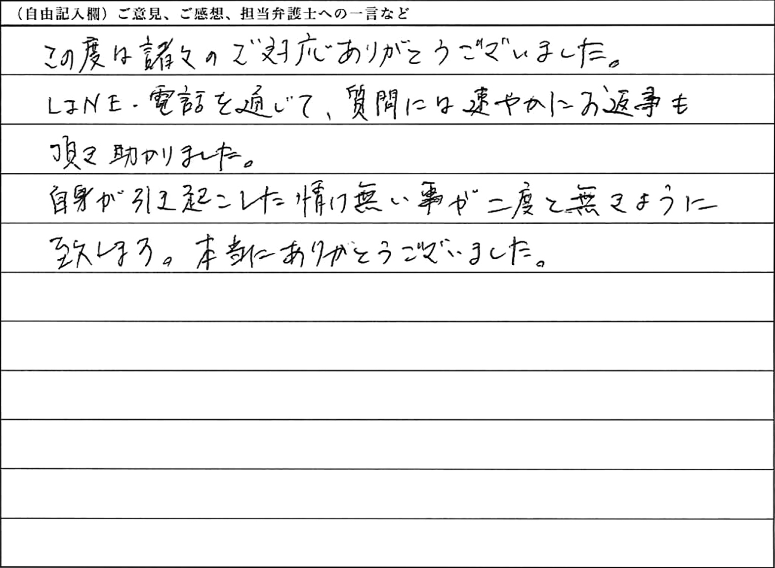 この度は、諸々のご対応ありがとうございました。LINE・電話を通じて、質問には速やかにお返事も頂き助かりました。自身が引き起こした情け無い事が二度と無きように致します。本当にありがとうございました。