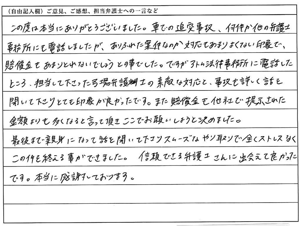 この度は本当にありがとうございました。車での追突事故、何件か他の弁護士事務所にも電話しましたが、ありふれた案件なのか、対応もあまりよくない印象で、賠償金もあまりとれないでしょうとの事でした。ですが、アトム法律事務所に電話したところ、担当して下さった弓場弁護士の素敵な対応と、事故も詳しく話を聞いて下さり、とても印象が良かったです。また、賠償金も他社で提示された金額よりも多くなると言って頂き、ここでお願いしようと決めました。最後まで親身になって話を聞いて下さり、スムーズなやり取りで全くストレスなくこの件を終える事ができました。信頼できる弁護士さんに出会えて良かったです。本当に感謝しております。