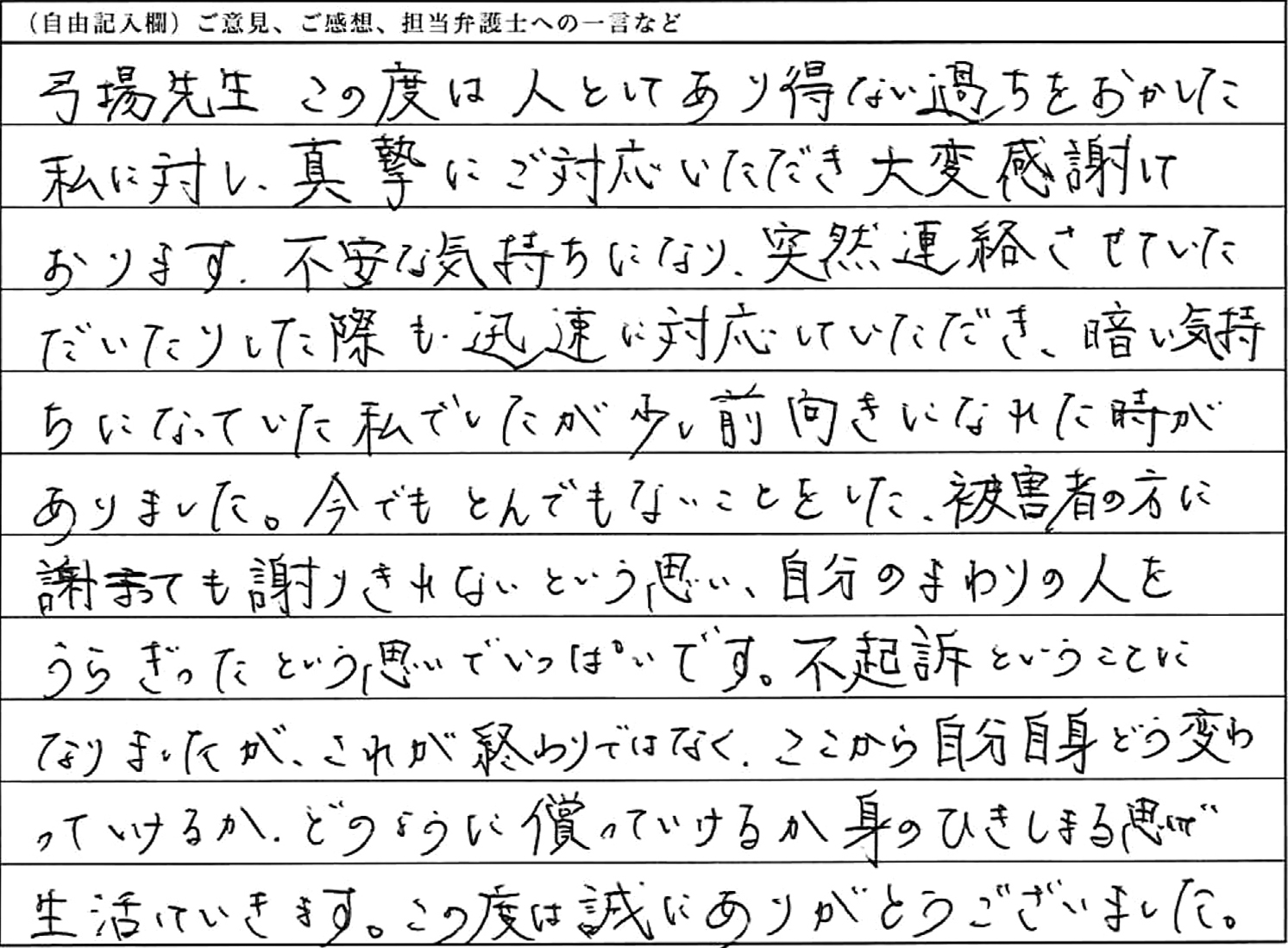 弓場先生 この度は、人としてあり得ない過ちをおかした私に対し、真摯にご対応いただき大変感謝しております。不安な気持ちになり、突然連絡させていただいたりした際も、迅速に対応していただき、暗い気持ちになっていた私でしたが、少し前向きになれた時がありました。今でもとんでもないことをした、被害者の方に謝っても謝りきれないという思い、自分のまわりの人をうらぎったという思いでいっぱいです。不起訴ということになりましたが、これが終わりではなく、ここから自分自身どう変わっていけるか、どのように償っていけるか身のひきしまる思いで生活していきます。この度は誠にありがとうございました。